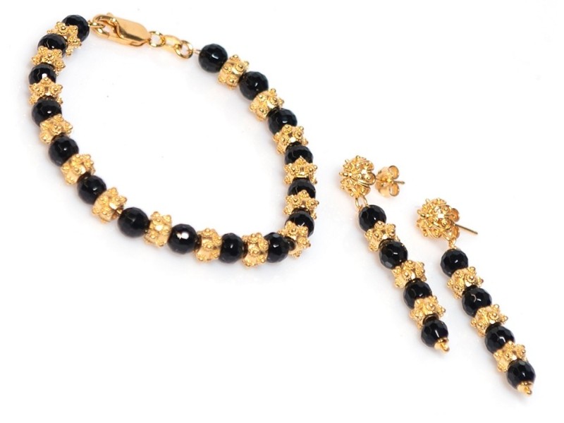 Bij ons koop je de mooiste Surinaamse sieraden, zoals deze vergulde Surinaamse armband met zwarte kralen.