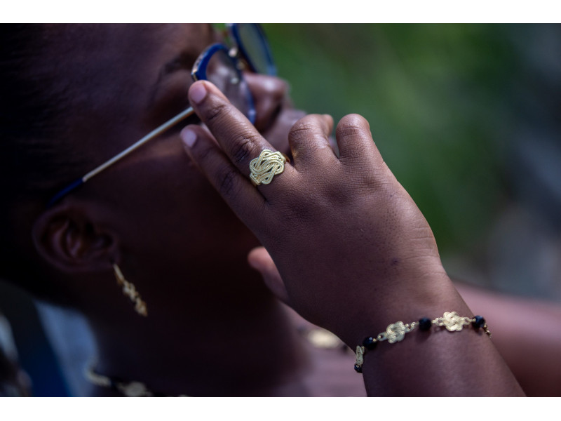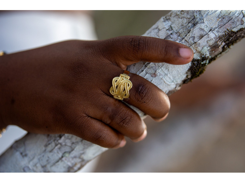 Bij ons koop je de mooiste Surinaamse sieraden, zoals deze vergulde mattenklopper ring.